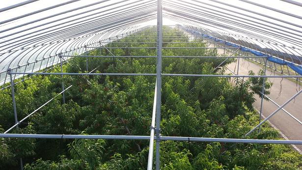 当園のもも狩り園地にはビニールの屋根を設置しています。