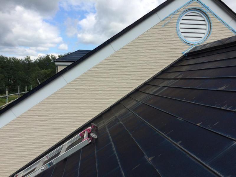 山形のサイディング塗替えは水戸部塗装へ!シーリング隊長です。最近は寒いくらいで着替えもあまり要らなくなってきましたね。昨日一昨日行ってきた山形市内、金属サイディングでの改修現場です。普通に足場は掛けてあるのですが、7寸勾配の屋根の上だけ足場がありません…。ハイパーVを履いて、上がってってみると意外と平気。危なくない様に足場がわりに雪止めから梯子をかけて無事完了。 台風の影響もありますがここにきて空梅雨の影響かどうか秋の長雨の予感…。でも、今のうちに降ってくれると雪が少なくなるのでしょうかねぇ…。