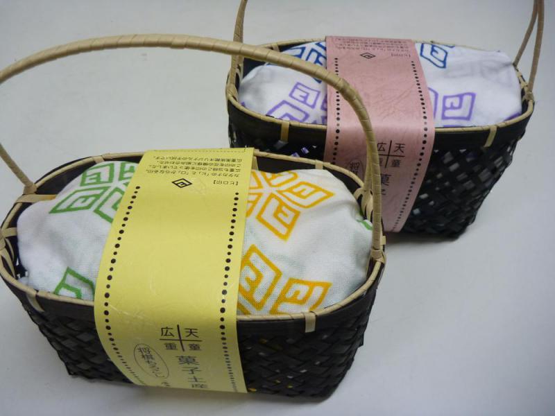 広重美術館のオリジナル手拭いに新色が登場しました!菓子土産が包まれている「ヒロ印手拭い」(写真左)は現在、青×紫と黄色×黄緑の2種類が販売中です。(青×紫は残りわずかです!)「履物づくし」(写真右)は青×ピンクが新しく入荷しました。ぜひお手に取ってご覧ください♪