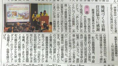 昨日、12月23日(水)午後1時から、川西町農村環境改善センターを会場に、平成27年度あしたのまち・くらしづくり活動賞の内閣総理大臣賞受賞報告会並びに祝賀パーティーが開催されました。約100名もの参加者があり、会場は満員状態で祝賀気分と熱気で一杯になりました。平山実行委員長のあいさつの後、原田川西町長、舩山県議会議員、加藤川西議会議長の御祝辞をいただき、私、江本からの受賞報告と御礼を申し述べました。言いわけですが、今回の準備は実行委員会を組織はしたものの、実質的には「えき・まちネットこまつ」の段取りで進めました。先の食育ミュージカル東京公演や、18日までギリギリ参加者が確定しなかった不手際もあって、昨夜は徹夜状態。御礼のあいさつも考えず壇上に登ったものの、支離滅裂になってしまいました。ああ、恥ずかしい。でも、若くして病魔に襲われ逝ってしまった故大木千夏さんの「えき・まち活性化プロジェクト」に掛けた情熱や功績、その後の後輩達や大人達の協力やきずなの深さは伝わったのではないでしょうか。また、そう思いたいです。救われたのは、掲載している新聞記事にも写真がある、置賜農業高校チームアグリクションの生徒にお願いした活動報告の素晴らしさでした。最後の部分で、PCが勝手にアップデートの再起動を始め、プレゼンがストップするというハプニングもありましたが、生徒達の発表力に感嘆や賞賛の声しきり。エクセレントなプレゼンを、久しぶりに聞かせていただきました。また、乾杯の後にお願いしたラダリアの歌と踊りもブラボーでしたね。もう、確実に川西町の子ども観光大使に成りきっていますね。今度は、観光ガイドの台本も練習し、花笠踊りにも挑戦しましょう。兎にも角にも、1つの区切りが終了。みなさん、本当にありがとうございました。