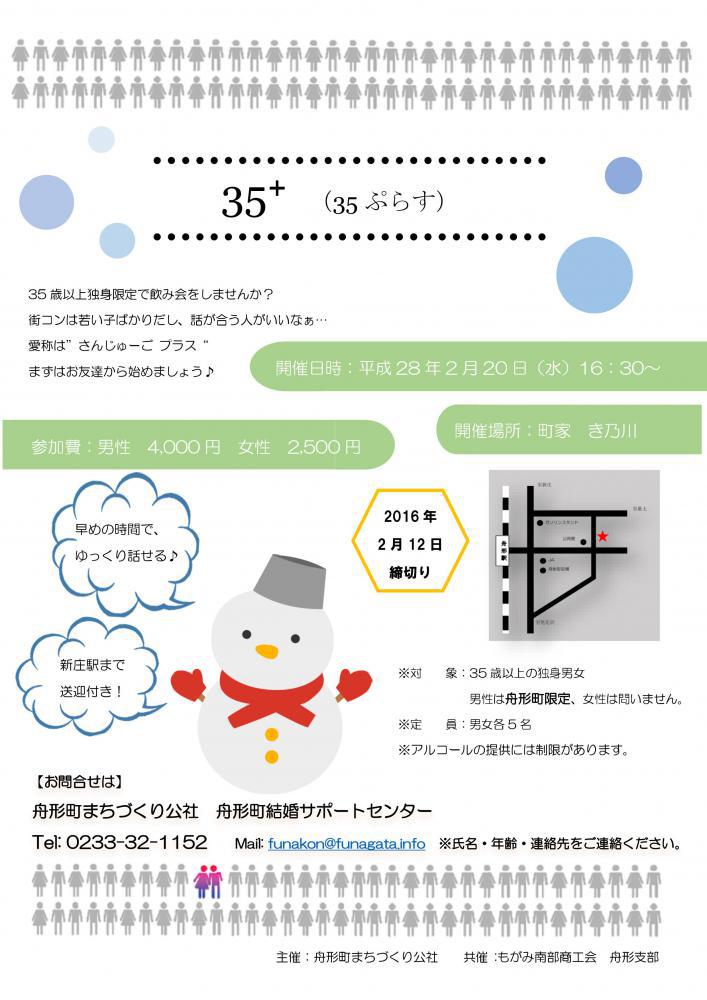 こんばんは?舟形町結婚サポートセンターです大寒を過ぎましたが、まだまだ寒さが厳しい町内ですが皆様体調など崩されていませんか?町内外の小中学校ではインフルエンザが流行り始め、休校の学校も出てきているようです…皆様も油断せずお身体お自愛くださいねさて本日は結婚サポートセンター主催のイベントのご紹介です!!『35+(35ぷらす)』同じ年代の人と楽しく気軽に出会えるようなそんな機会が欲しい…そんな意見から35+は生まれました。会話を楽しみながら、まずはお友達から始めませんか?日時:平成28年2月20日(土)16:30〜場所:舟形町 町家き乃川対象:35歳以上の独身の男女 ※男性は舟形町限定参加費:男性4,000円 女性2,500円開始も早めの時間帯なのでゆっくり会話を楽しめますよさらに新庄駅までの送迎付き!!連絡先の交換やマッチングは行わないので、個人情報が洩れる心配もありません。気になる方がいらっしゃいましたらスタッフまでお声がけください。その他詳細はお気軽にお問合せ下さい↓↓↓【お問合せ】舟形町結婚サポートセンターTEL : 0233-32-1152   FAX : 0233-32-1153Mail : funakon@funagata.info※氏名・年齢・連絡先をご連絡ください。
