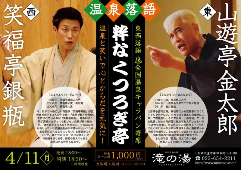 全国温泉キャラバン寄席【粋なくつろぎ亭】4/11(月)ほほえみの宿滝の湯にて開催受付18:00 開演18:30から1時間程度 料金お一人様1000円(税込) ※大浴場入浴付 【粋なくつろぎ亭】とは?日本の伝統文化である”温泉”と”笑い”により日本人の心とからだを元気にしたいという思いで結集した日本各地の「温泉宿」と、お茶の間で御馴染み「東」の桂歌丸、「西」の桂文枝両師匠が率いる「落語芸術協会」「上方落語協会」とが協同で繰りひろげるプロジェクトです。