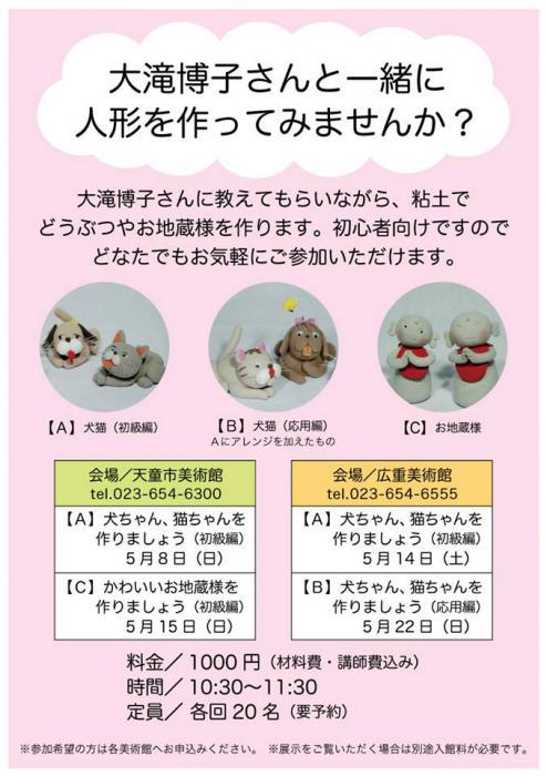23日24日は、天童の春の恒例イベント「人間将棋」が開催されています。今年はお天気も良く、桜舞う天童を散策しながら、「大滝博子創作人形展」に足を運んでくださっている方も多いようです。「大滝博子創作人形展」では5月に、作家の大滝博子さんによるワークショップが予定されています。大滝さんに教えてもらいながら、粘土でどうぶつやお地蔵様を作ります。初心者向けですので、どなたでもお気軽にご参加いただけます。 【A】犬ちゃん、猫ちゃんを作りましょう(初級編) 5月8日(日)天童市美術館 5月14日(土)広重美術館【B】犬ちゃん、猫ちゃんを作りましょう(応用編) 5月22日(日)広重美術館【C】かわいいお地蔵様を作りましょう(初級編) 5月15日(日)天童市美術館 料金/1000円(材料費・講師費込み)時間/10:30〜11:30定員/ 各回20名(要予約)申込/天童市美術館 tel.023-654-6300 広重美術館 tel.023-654-6555 参加を希望される方は各美術館へお申込みください。また、展示をご覧いただく場合は別途入館料が必要です。皆さまのご参加をお待ちいたしております!