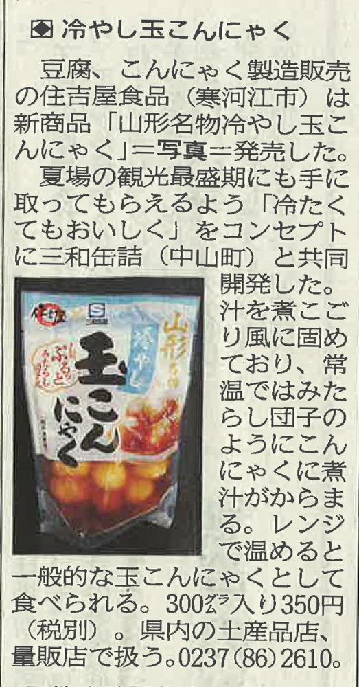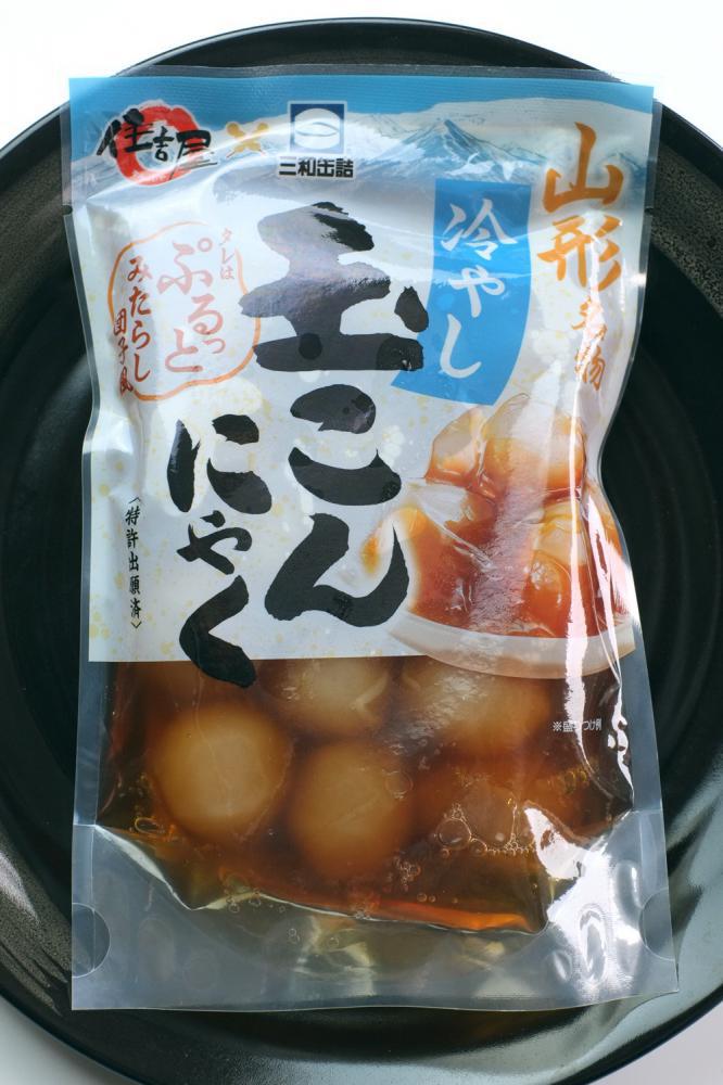 山形に新たな”冷やし文化”生まれる!?「山形名物・冷やし玉こんにゃく」は・・・山形名物の「玉こんにゃく」を夏場の観光最盛期にも手にとってもらえるよう、「冷たくてもおいしく」をコンセプトに住吉屋食品と三和缶詰が共同開発いたしました。▼煮こごり風の煮汁です! 汁を「みたらし団子」のように固める事で、 こんにゃくに煮汁が絡まり、そのまま美味しく食べられます。▼温めると変身します! 温かい玉こんにゃくが食べたい方は、 レンジで温めると「煮こごり風煮汁」が溶けて 熱々の玉こんにゃくに変身します。▼山形県産品にこだわりました! 自社のこんにゃくはもちろんの事、 味付け素材は山形県産品にこだわって作りました。