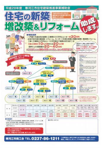 9月20日(火)より補助金受付が再開となりました。(追加予算は1500万円)予算残高を含む詳細は市HPより「平成28年度寒河江市住宅建築推進事業補助金」で検索(申請様式もダウンロードできます) 商工会が作成したチラシのダウンロードはこちらをクリック! → ダウンロード