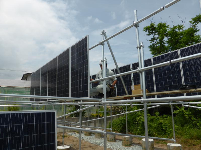 工事中の野立て太陽光のパネル取付が始まりました。