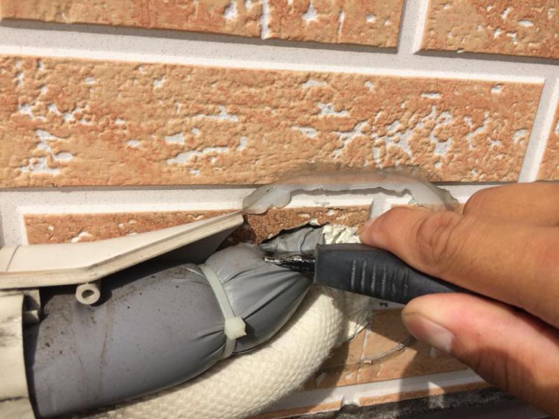 山形のサイディング塗り替えは水戸部塗装へ!シーリング隊長です。 今年は台風の当たり年。正に今、すぐそこまで来てますね…変な動きの10号が。各地に警報が出てますが、大した被害もなく通り過ぎてくれることを祈るばかりです。 台風シーズンになると必ずと言っていいほどくる電話が昨日の横雨で漏水したんだけど…って、電話です。数十年前ならいざ知らず、今の建物はほぼほぼシールが起因する漏水はありません。が、漏水しているのも事実。 サッシ廻りには防水テープが貼られ下から順々に透湿シートが張られていますが見落とすのが横の管理が行き届かないこういった貫通部。こちらの建物は、テナント屋さんが頼んだエアコン業者さんの不始末。今まで見てきた中では、シールしてあるだけまだましな方ですが…。酷い業者になると、レジ袋が突っ込んであったり何も処置されてなかったりしますので。 この物件は、オーナーさんが、取り付けた業者を呼ぶからいい!ってことで、処置をしてこなかったのですが今日は漏水してないと良いな…
