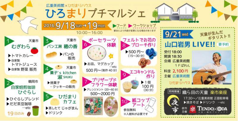 広重美術館とひだまりハウスのコラボイベント第4弾。今回は9月18日(日)19日(祝)に開催します。秋、のんびりお茶しながら、手づくり体験を楽しむ…そんな2日間になればいいなと思っています。ぜひ遊びに来てください(^_^)/また21日(水)夜には、天童が生んだギタリスト「山口岩男ライブ」を行います。当日は、美術館前で楽市楽座“夜市”も同時開催されますので、どうぞお楽しみに。