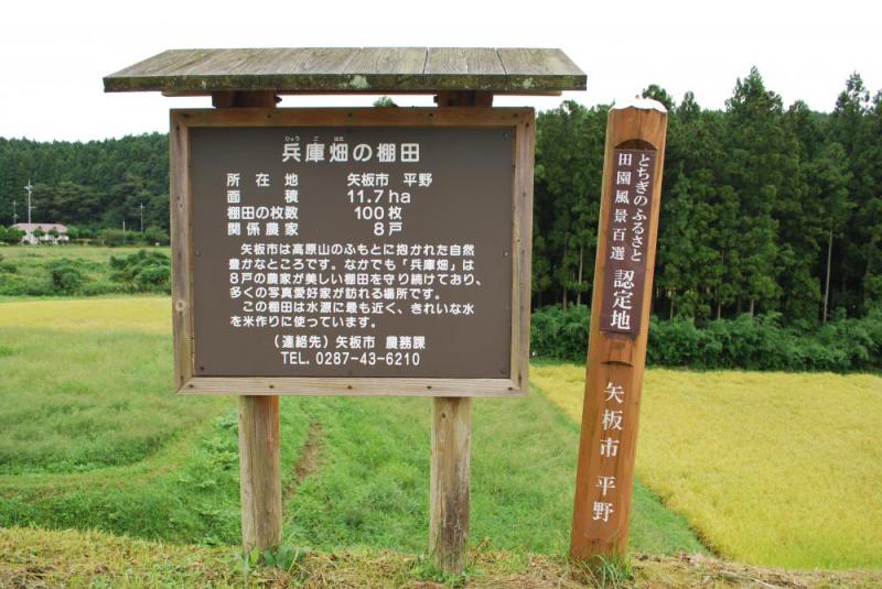 東芝時代の職場上司の定年激励と孫ひろきの3歳誕生祝いで東京へ向かう、途中時間があるので栃木の高原山のふもとに抱かれた自然豊かなところにある「兵庫畑(ひょうごばた)」という棚田に立ち寄ってみた、8戸の農家が「棚田オーナー制度」を実施し、昔ながらの農作業体験と美味しいごはんでもてなす取り組みをしている、写真愛好家もよくおとづれるようでよく手入れされた田んぼがきれいでした。微妙なかかしが一体だけ気になります・・