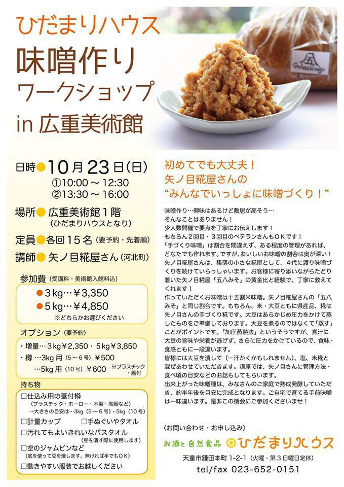 お陰様で、今回で3回目の開催となります味噌作りワークショップ。初めての方でもご安心ください。矢ノ目麹屋さんの糀と大豆で、お味噌屋さんのご指導の下、美味しい美味しいお味噌が作れます。是非、この機会に手作りしにいらしてください(^_−)−☆10月23日(日)午前の部10:00〜、午後の部13:30〜とも定員15名です。先着順で締め切らせていただきます。ご予約はお早めに!
