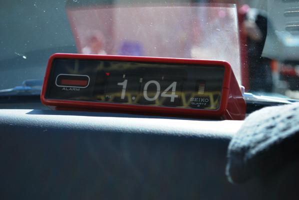 オーナーのこだわりが随所に見えてくる、バンが並んでいてカローラバンのオーナーさんとお話、運転席もどうぞということで見ると面白い、助手席にある時計、昔バタバタと数字が半分ずつ書かれた多数の薄いプラスチック板をはめたもので回転で上下の板で構成され文字板により時刻を直読する時計、飛行場とかの発着時刻、歌のベストテンで見たねー、それに飲み物を置いとく小物、しかもビンもビンテージなんてネ!コイン入もありました、小銭をいれて上から取り出すやつ、高速の支払いなど便利だった、それにステッカー、ポルシェのカレラのパクリでカローラ、わざとらしく貼ってある、昔私もステッカー購入して貼りました、カセットも70年代もの、いいねー、こだわるねーで、話盛り上がっちゃいました。運転席からジャンバラヤズの歌聴いて・・