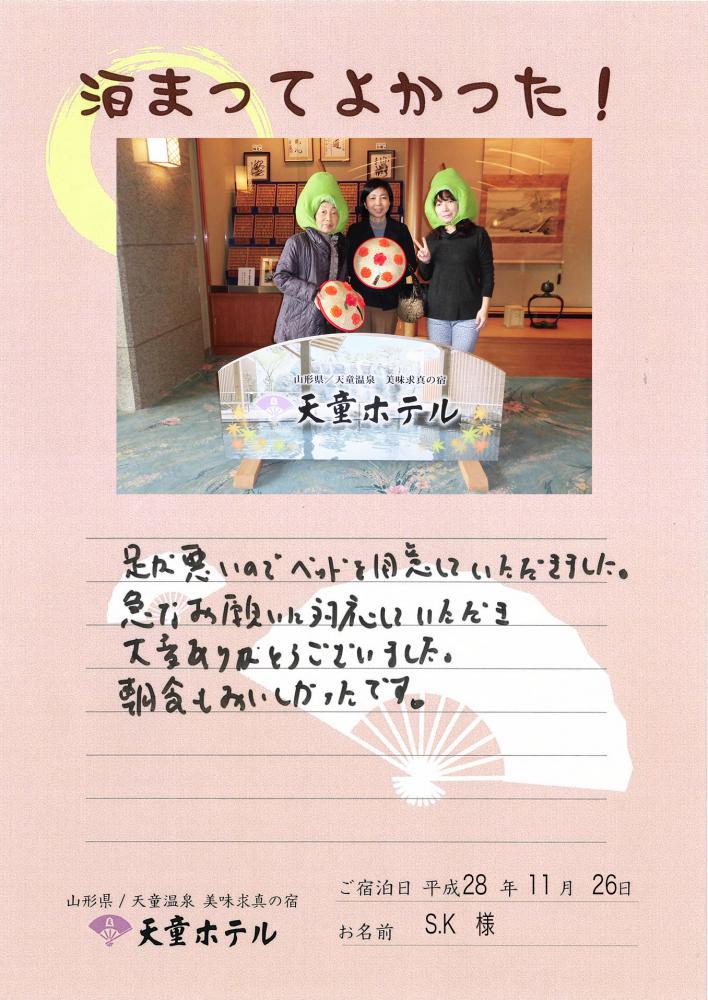 お客様からお寄せいただきました「おすすめの声」をご紹介いたします☆ーーーーーーーーーーーーーーーーーーーーーーーーーーーーーーー足が悪いのでベッドを用意していただきました。急なお願いに対応していただき大変ありがとうございます。朝食もおいしかったです。福島県 S.K様 〈2016年11月26日ご宿泊〉ーーーーーーーーーーーーーーーーーーーーーーーーーーーーーーS.K様この度は山形旅行の宿泊先に当館をお選び頂き誠にありがとうございます。また〈泊まってよかった!〉にご協力いただき重ねてお礼申し上げます。当館は、通常ですと和室に布団を敷いておりますが、布団が不便な方のために簡易ベッドもご用意しております。ベッドをご利用頂き快適にお過ごしになられたご様子でほっといたしました。翌日ご出発時の皆様の笑顔をみて私どもも大変嬉しくなりました!お客様に喜ばれるサービスを追求しこれからも精進して参りますのでぜひまた皆様でお越しくださいませ。この度のご宿泊誠にありがとうございました。>>他にもおすすめの声頂戴しております♪美味求真の宿 天童ホテル 公式HPhttp://www.tendohotel.co.jp/
