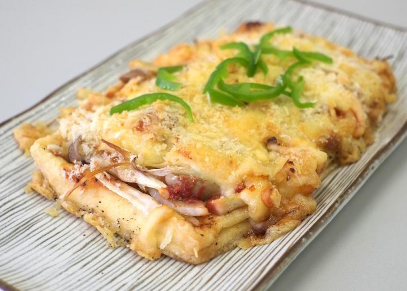 チーズがとろり♪子どもも大好きイタリアンな「油揚げピザ」。お客様の声から生まれた商品で、新豆祭限定で販売します!豆腐のタンパク質もとれ、野菜がたっぷりのったヘルシーな油揚げピザです。ぜひお試しあれ!