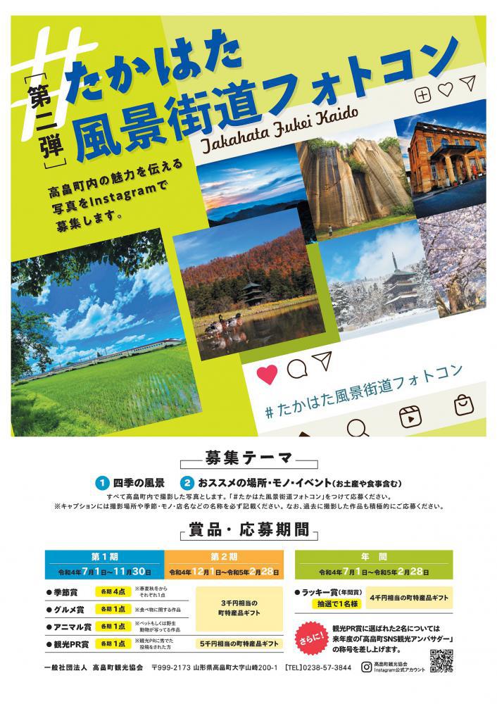 ↑ 応募方法の詳細はこちら[第2弾!]たかはた風景街道フォトコン開催!!作品を大・大・大募集しています!1.募集テーマ ・四季の風景 ・おススメの場所・モノ・イベント2.募集期間 ・第1期 令和4年7月1日〜11月30日 ・第2期 令和4年12月1日〜令和5年2月28日3.賞品 ・季節賞、グルメ賞、アニマル賞 3千円相当の町特産品ギフト 各期4点 ・観光PR賞 5千円相当の町特産品ギフト 各期1点 ・ラッキー賞 4千円相当の町特産品ギフト 年間通して抽選で1名様4.エントリー方法 @Instagrammで高畠町観光協会の公式アカウントをフォローしてください。 A「#たかはた風景街道フォトコン」を付けて応募(投稿)してください。投稿された作品を当協会が選定し、リポスト(再投稿)します。 Bリポストされた作品の中から、期間ごとに選考委員がそれぞれの賞を決定!お問合せ:一般社団法人 高畠町観光協会п@ :0238-57-3844