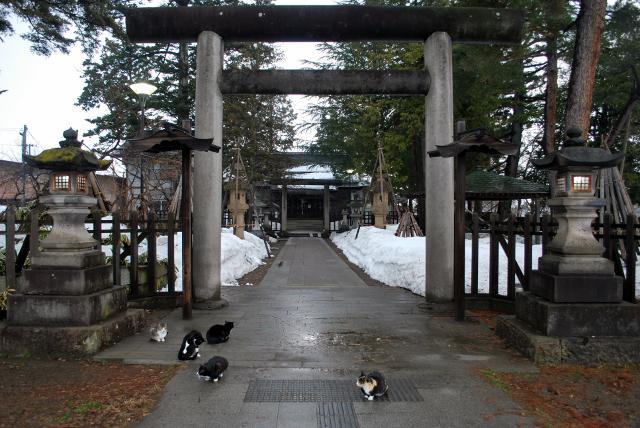 朝お通勤前、松岬(まつがさき)神社前を通ると猫が集まる、どうもここをねぐらにしているようです、この神社は明治35年(1902)に上杉神社から上杉鷹山を分祀し大正元年に建立、その後米沢初代藩主”上杉景勝”、その重心”直江兼続”鷹山の師、鷹山改革の補佐の合祀と祭神6柱となっている。最近猫が付いてくるように、たまに餌やるから?奥の狛犬の横によく猫がいる、狛犬とあるけど、狛犬の起源は、古代インド、守護獣としてライオンの像を置いたのが始まりといわれて、古代エジプトなどでも神域を守るライオンの像がある、狛犬はインドから中国へ伝わり、中国から日本へ伝わってきたのは飛鳥時代といわれています。平安時代に獅子と狛犬の像が一対となっておかれるようになり、もともとはそれぞれを獅子と狛犬と呼んでいましたが、現在は両方を合わせて「狛犬」と呼ぶようです、しかしライオンはねこ科なんだから犬ではないんだけどね・・そこんとこがわからない???じじの独り言