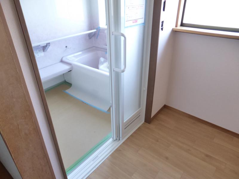 バスルームへとつづく洗面脱衣室の内装が完了しました。