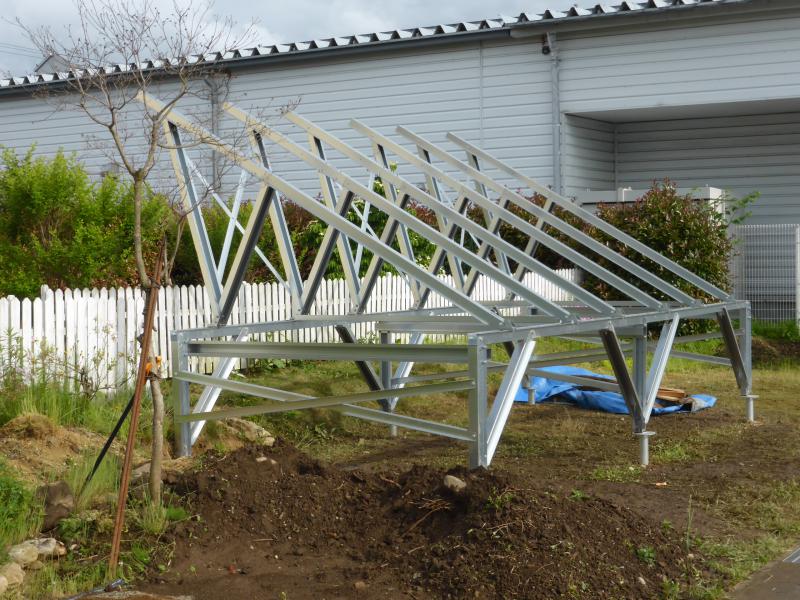 今日はあいにくの雨でしたが、先日打込みを行ったスクリュー杭の上に架台を組んでいきました。