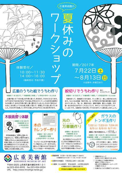 期間/2017年7月22日(土)〜 8月13日(日) ※会期中、休館日あり体験受付/10:00〜11:30、14:00〜16:00 (随時受付・予約不要)◆広重のうちわ絵でうちわ作り体験料1本500円/作業時間2時間/小学校中学年〜大人向き 広重が描いた「うちわ絵」を竹骨に張って、色をぬり、うちわに仕立てます。江戸のまちではさまざまな「うちわ絵」が売られていて、人々は好きな絵柄のものを買って、自分の竹骨に張り、暑い夏をすごしました。やぶれて使えなくなると、また新しい「うちわ絵」を買って張って…修理してくり返し使っていました。うちわ作りを通して、手作りの楽しさや江戸のエコ生活を学びます。◆紋切りでうちわ作り体験料1本500円/作業時間1時間/小学校低学年〜大人向き 色紙を折って、型紙通りに切り抜き、そっと開くと…美しい紋があらわれます。もとになる型紙「紋切り型」は、江戸時代の寺子屋の教科書にも紹介されていました。「紋」は、家紋のほか、植物や動物、暮らしの道具、月や星…あらゆるものがモチーフになっていて、粋でユーモラスなデザインがいっぱいです。伝統的な「日本の形」でうちわを作って、夏を楽しみましょう。(協力:エクスプランテ)◆木版画摺り体験体験料5枚500円/作業時間30分/小学校低学年〜大人向き 浮世絵版画は、「絵師」が描いた下絵をもとに、「彫師」が版木を彫り、「摺師」がその上に絵の具をのせて和紙に摺る、というように大変な技術と時間をかけてつくられました。浮世絵がどのようにつくられたのか、「摺師」の仕事を体験します。◆木のカレンダー作り体験料1個1,000円/作業時間2時間/小学校中学年〜大人向きウッドピースに文字や数字を書いて、木製のカレンダーを作ります。画びょうで張りかえができるのでアレンジ自由!一年中使えます。◆光の万華鏡作り体験料1個300円/作業時間30分/小学校低学年〜大人向き 光と特別なフィルムだけでにじ色の万華鏡を作ります。ミラーや色のついた材料(ビーズ、セロハン)は使いません。光の不思議を体験してみよう!◆ガラスのトンボ玉作り【日にち限定】7/22(土)7/23(日)7/24(月)8/5(土)8/6(日)8/7(月)講師/鈴木美智さん(山形市出身・パリ在住)体験料1個1,500円(夏休み特別料金)/作業時間1時間/小学校低学年〜大人向き(小学生は保護者の付き添いが必要です)ガラス作家と一緒に、世界にひとつだけのオリジナルのトンボ玉を作ってみませんか?□ 混雑状況によってお待ちいただく場合がございます。□ 10名様以上で体験の場合は事前にご予約ください。 (貸し切りの情報はホームページで ご確認ください)□ 在庫がなくなり次第終了となります。※体験料のほかに入館料が必要です。