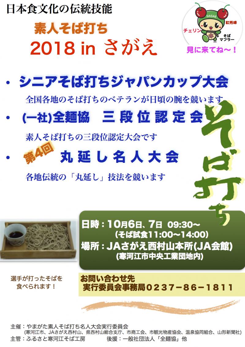 2018年素人そば打ち三段位認定大会を、下記のとおり開催します。どうぞ皆さんお誘い合わせのうえご来場下さい。 ※会場では打ちたての美味しいお蕎麦が食べられます。(11:00〜14:00) お気軽にお越し下さい。○全麺協三段位認定大会   《素人そば打ちの有段者が目指してきました。更に上の段位に挑戦し技を披露します。》   10月7日(日) 9:30〜 開催場所:寒河江市 JAさがえ西村山本所 特設会場   991-0061 寒河江市中央工業団地75 問合せ先(お電話でお願いします)   大会事務局(佐々木、中野)   991-0523 寒河江市大字八鍬字川原919−6  さくらんぼ会館内   п@0237-86-1811 ※なお、初段位・二段位の寒河江認定大会は12月1日(土)に、また第22回「やまがた素人そば打ち名人大会」は翌日の12月2日(日)に開催を予定しています。 ※音楽に合わせて楽しくそばを打つパフォーマンスをYouTubeで公開しています。YouTubeの検索欄に「ふるさと寒河江」、「そば打ち」と入力し検索してご覧下さい。
