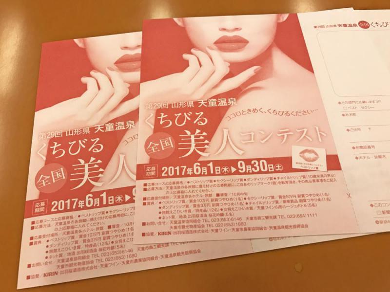 応募受付開始から約2カ月で当館の応募BOXにもたくさんのエントリー用紙が集まっているようです♪それぞれの賞の受賞者には天童市ならではの副賞もあるようなので、まだエントリーされていない方はお早めにご応募くださいませ♪応募〆切は9/30までですよ!【くちびる美人コンテスト】応募方法:天童温泉の各旅館に備え付けの応募用紙に、ご自身のリップマークを転写いただき、その他必要事項をご記入の上応募箱にお入れください。応募コース:ベストリップ賞、チャイルドリップ賞、ダンディリップ賞など賞品:応募コースに合わせて賞金や副賞が授与されます天童市観光協会 http://bussan-tendo.gr.jp/db/?d=7814 美味求真の宿 天童ホテルhttp://www.tendohotel.co.jp/