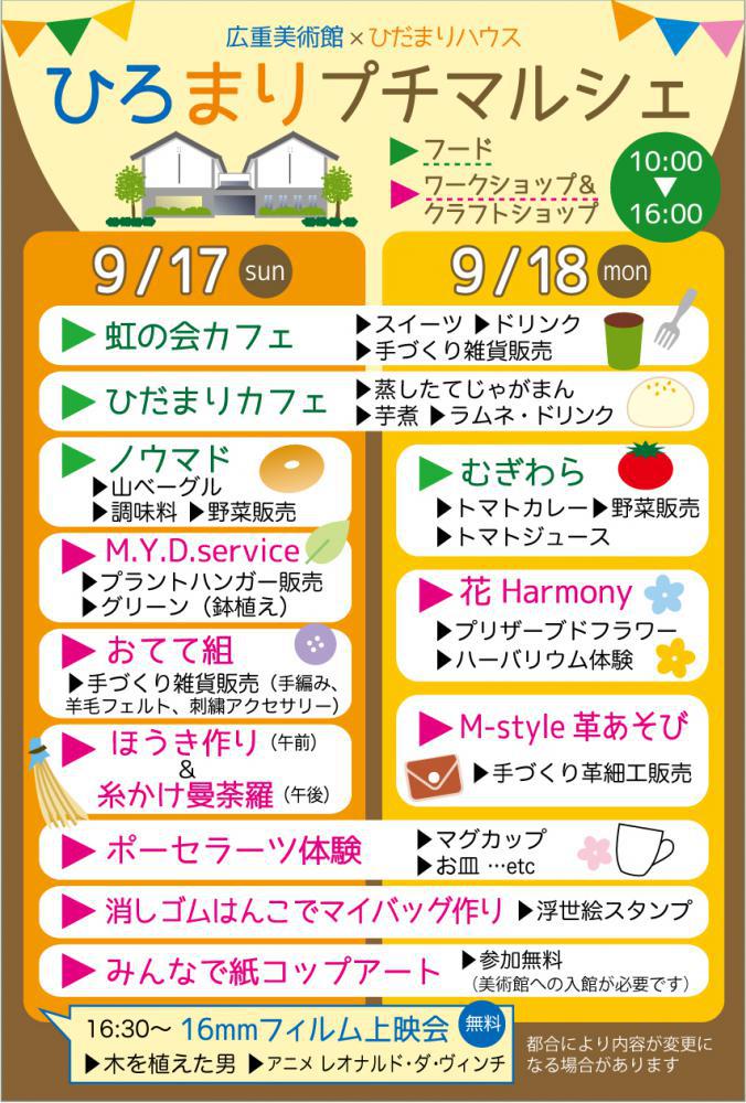 いよいよ明日•明後日にせまった「ひろまりプチマルシェ2017秋」。開催期間中に台風の接近•通過が予想されますが、イベントは会場を屋内に変更して予定通り行います。皆さまお気をつけて、どうぞお出かけください(^o^)/