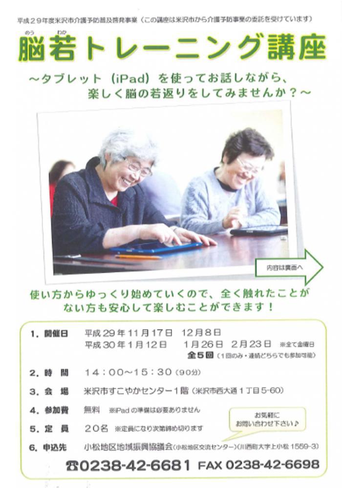 【脳若トレーニング講座】米沢市で開催いたします。(平成29年度米沢市介護予防普及啓発事業)◇小松地区交流センター(小松地区地域振興協議会)で実施しております、タブレット(ipad)を使った楽しい脳の若返り講座を米沢市すこやかセンターで開催いたします。この講座はタブレットには馴染みのないご高齢の方でも気軽に楽しく(ipad)を体験していただき、会話を楽しみながら「脳内運動」を進め、元気でイキイキとした生活を送っていただくことを目的としています。お1人でもグループでもお気軽にご参加ください。〇実施日 ・11/17 ・12/8 ・1/12 ・1/26 ・2/23〇時 間 午後2時〜3時30分(約90分)〇会 場 米沢市すこやかセンター1階(米沢市西大通1-5-60)〇参加費 無料〇定 員 20名〇申込先 小松地区交流センター(42-6681)川西町上小松1559-3※タブレットは準備しております。お申込みは電話又はFAXでお気軽にお願いいたします。※タブレットを全く利用したことがない方でもサポートいたしますので、お気軽にご参加ください。