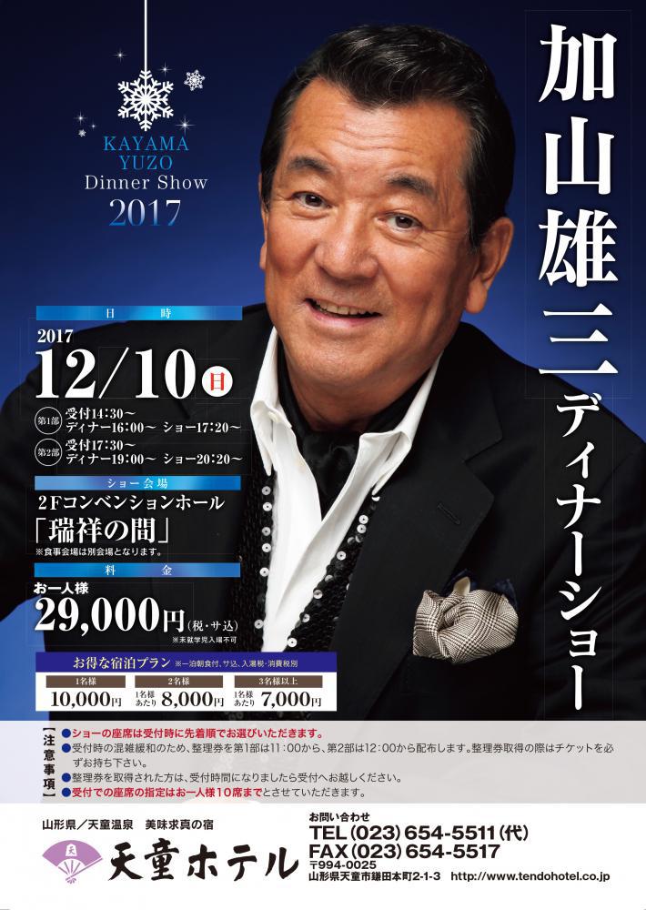 こだわりのお料理と加山雄三の色褪せぬ歌声で楽しむ一夜。たくさんのご来場お待ちしております。日時:2017年12月10日(日) 第1部 受付14:30 ディナー16:00〜 ショー17:20〜 第2部 受付17:30 ディナー19:00〜 ショー20:20〜料金:お一人様29,000円(税・サ込)※未就学児入場不可《一泊朝食付のご宿泊も併せてどうぞ! 》1名様 10,000円2名様の場合お一人様8,000円3名様以上の場合お一人様7,000円※宿泊料はすべてサ込、消費税・入湯税別【注意事項】※ショーの座席は受付時に先着順でお選びいただきます。※受付時の混雑緩和のため、整理券を第1部は11:00から、第2部 は12:00から配布します。整理券取得の際はチケットを必ずお 持ちください。※整理券を取得された方は、受付時間になりましたら受付へお越 しください。※受付での座席はお一人様10席までとさせていただきます。▼チケット・宿泊のお問合せは美味求真の宿 天童ホテル TEL 023-654-5511▼メールでのお問合せはこちらから美味求真の宿 天童ホテル 公式HPhttp://www.tendohotel.co.jp/