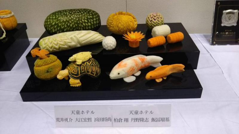 山形市のビッグウィングで開催された『ものづくりフェスタin山形2017』に当館の日本料理部門からも出展いたしました。日本料理料理人6名による、渾身の合作です。冬瓜、紅芯大根、大根、人参、かぼちゃを使って、菊の花や米俵、鯉や亀を表現しました。細かいところにも様々な細工が施されています。ぜひ手に取って見て頂きたい!作品です。日々腕を磨いていますよ〜!美味求真の宿 天童ホテルhttp://www.tendohotel.co.jp