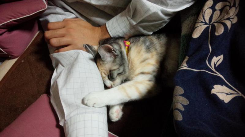こたつで爆睡のデッカイ兄ちゃんと、こたつからホッカホカになって出てきたにこちゃん。
