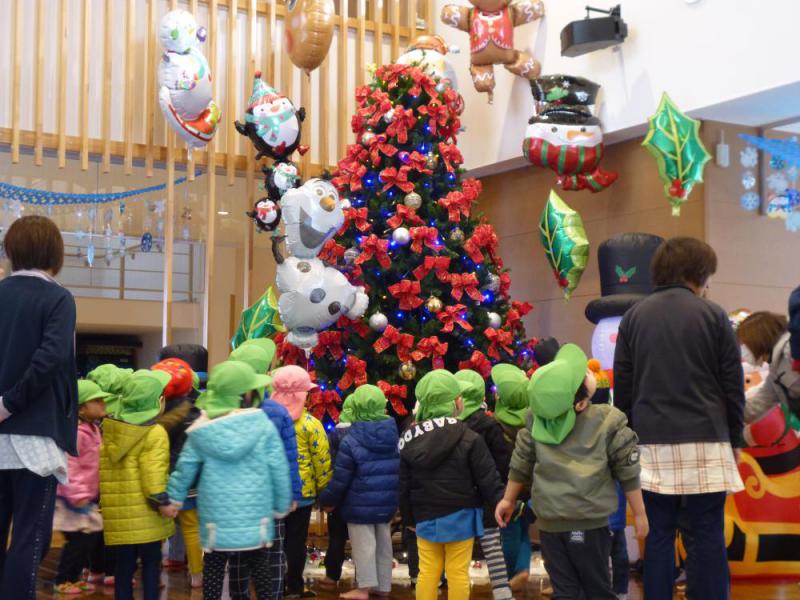 12月21日は、今年最後の保育園の訪問日です。本日来荘したのは、朝日町にあるあさひ保育園の3歳と5歳の子供たちです。はじめに3歳の子供たちがクリスマスツリーと一緒に写真を撮りに来ました。大きなツリーに興味深々な子供たちは、ツリーを囲んで楽しそうにおしゃべりしていました。その後施設内を探検し、事務室・厨房・医務室など見て回りました。3歳児が帰った後、入れ替わりで5歳の子供たちが来てお遊戯の披露をしてくれました。お歌を1曲歌った後、手遊び歌の「幸せなら手をたたこう」を入居者さんを交えてみんなで行いました。「手をたたこう」の部分を「ほっぺさわろう」「だっこしよう」と変えた歌に合わせて動作を交えながら遊びました。いつもは笑顔が少ない入居者さんが満面の笑顔で子供たちと触れ合う様子に驚き、嬉しくなりました。あさひ保育園の皆さん、先生方、本当にありがとうございました。 12月に5つの保育園訪問を受け、合計270名の子供たちが遊びに来ました。1番に感じたのは「子供たちのパワー」です。子供たちの声や姿を聞く・見るだけで、自然に笑顔になる入居者さんを見ると子供たちの影響力を実感します。12月来てくれた保育園の皆さんありがとうございました。またおじいちゃんおばあちゃんに元気を届けに来てくださいね!