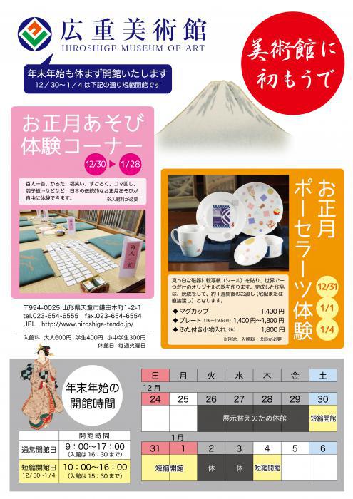 広重美術館は年末年始も休まず開館します!ただし、12/30〜1/4は短縮時間10:00〜16:00で開館します。なお1/2、3は休館日となります。ぜひ “美術館に初もうで” にいらしてください(^ ^)/