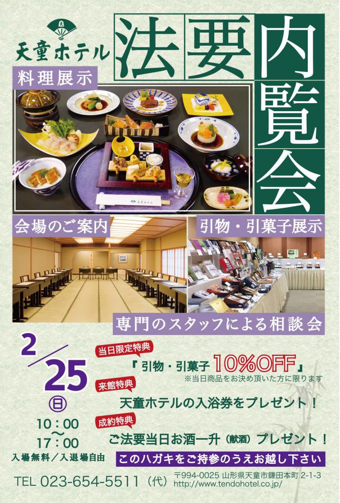 2月25日(日)ご法要内覧会を開催いたします。お料理はもちろんのこと引物、引菓子等実際にご覧いただけます。また、専門スタッフによる個別相談も承りますのでお気軽にお越し下さいませ。 ◎【当日限定】引物・引菓子10%OFF!◎来館特典として、天童ホテルの入浴券をプレゼント!◎成約特典として、ご法要当日にお酒一升(献酒)プレゼント!日時:2018年2月25日(日)時間:10:00〜17:00入場:無料ご自由に見学していただけます。個別相談等ご希望の方はご予約いただけるとスムーズにご案内できます。▼ご予約・お問合せはこちら美味求真の宿 天童ホテル TEL 023-654-5511メールでのお問い合わせ 美味求真の宿 天童ホテル 公式HPhttp://www.tendohotel.co.jp/