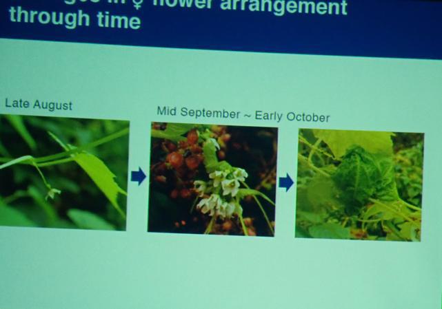 ミヤマニガウリの葉が囲んでいる様子を「葉の温室」と表現しています。(決定)8月初旬長柄の両性花〜9月中旬短柄に両性花群〜10月初旬「温室」