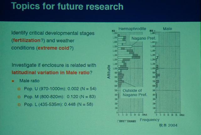 寒さと関係している点で(970〜1000m9)早く出来驚く程「温室」の出来が多い。雄比率は低い、白の部分は長野県のミヤマニガウリ、秋本氏2004年です。この資料は2018.3第65回日本生態学大会での京都大酒井章子氏の英語口頭発表による。
