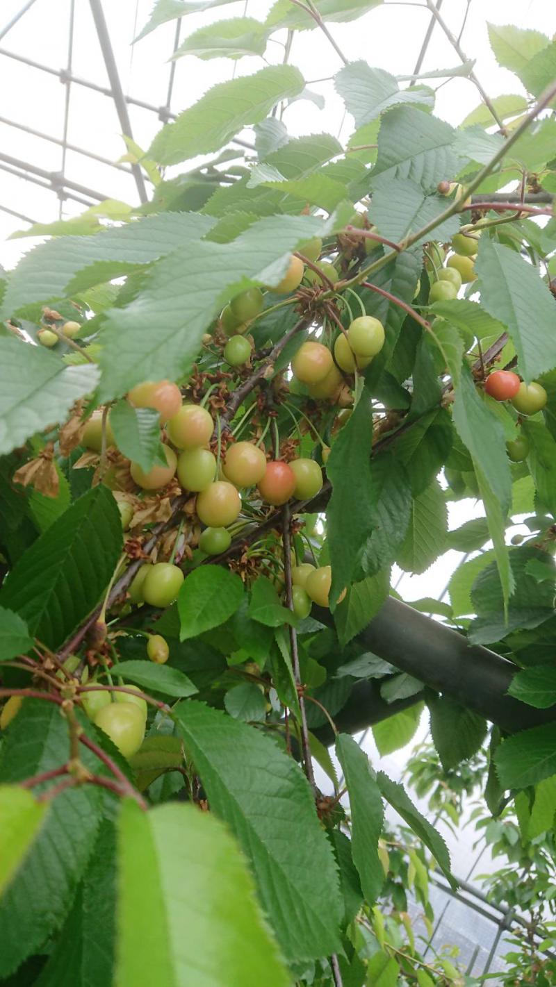 温室さくらんぼハウス1号園のさくらんぼが色付いてきました。