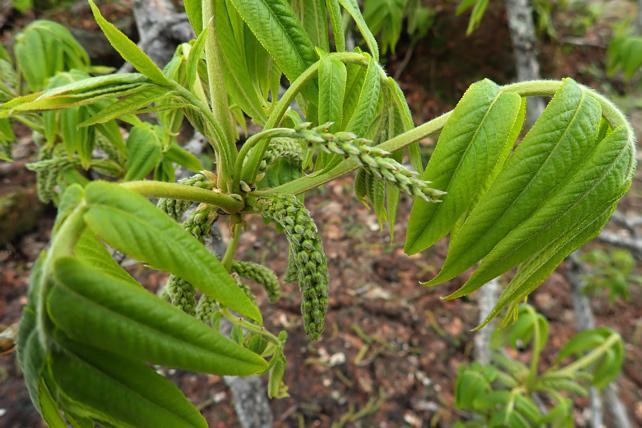 蕾の中には雄花(4本の雄花垂れ下がり)雌花(やや上前を向いて蕾み紅色)がみられます。混芽です。今盛んに雄花が花粉を散らし、風に舞って落ちてきています。