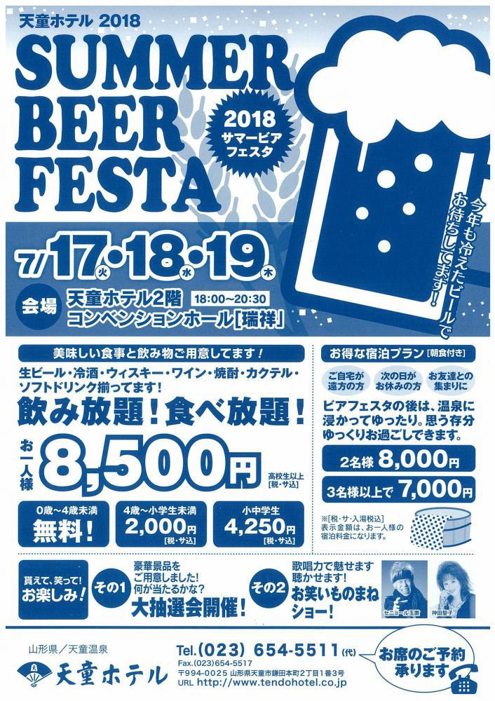 毎年恒例、夏の盛大なイベント「サマービアフェスタ2018」を今年も開催します!今年は、7月17日、18日、19日の3日間です。生ビールなど飲み物が飲み放題!和洋中バイキング食べ放題!のビアフェスタです。人気のお寿司コーナーや焼きそばなどライブキッチンコーナーもあり!ゲスト2名によるショータイムや大抽選会もご用意しております★ビールが美味しい夏の夜を一緒に盛り上がりましょう!たくさんの方のご来場をお待ちしております。チケット好評受付中です!■詳細■日にち:2018年7月17日、18日、19日時 間:18:00ー20:30場 所:天童ホテル2階コンベンションホール「瑞祥」料 金:高校生以上8,500円、小中学生4,250円、4歳〜小学生未満2,000円、4歳未満は無料内 容:★飲み放題【生ビール/冷酒/ウイスキー/ワイン/焼酎/カクテル/ソフトドリンク】★食べ放題【和洋中バイキング】★豪華景品が当たる大抽選会開催!★ものまねショー開催!【セニョール玉置さん】【神田聖子さん】――――――――――――――――――――■ビアフェスタ後そのままご宿泊頂けます!(一泊朝食付プラン) ・2名様一室の場合 :お一人様8,000円 ・3名様以上一室の場合:お一人様7,000円――――――――――――――――――――※上記価格はすべて税込表示です▼チケット購入/お問合せ天童ホテル TEL 023-654-5511美味求真の宿 天童ホテル 公式HPhttp://www.tendohotel.co.jp/