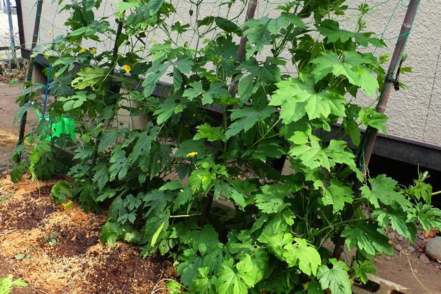 現役の頃から畑大好き。借地で野菜作りをしてきた。今はそれも無く、屋敷内の土盛りの上に数年盛り土してやっと畑に。成長と実なりが楽しみ。 これは西側にゴーヤを。日よけにも良い。