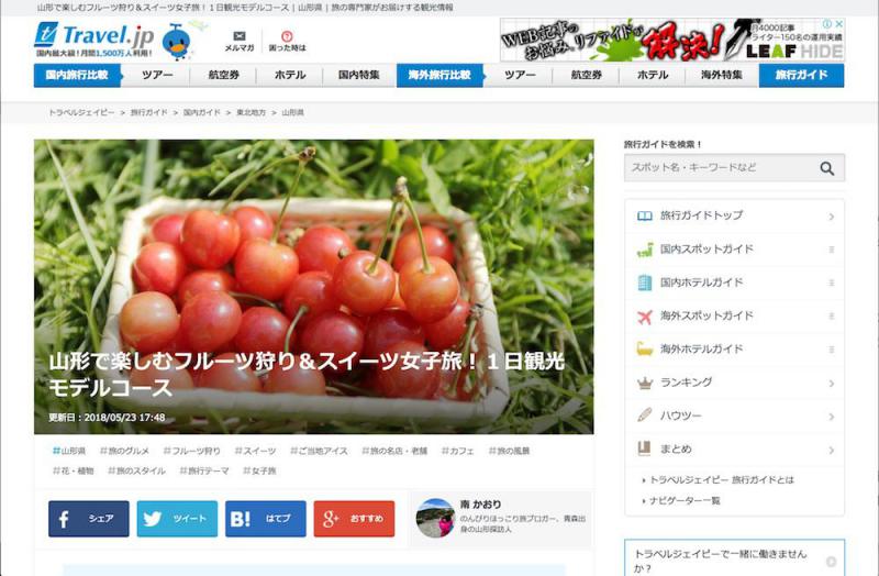 トラベルジェーピーの「山形で楽しむフルーツ狩り&スイーツ女子旅!1日観光モデルコース」にフルッティアをご紹介頂きました!フルーツ王国山形の観光をぜひお楽しみ下さい。→ 「山形で楽しむフルーツ狩り&スイーツ女子旅!1日観光モデルコース」の紹介ページはこちら