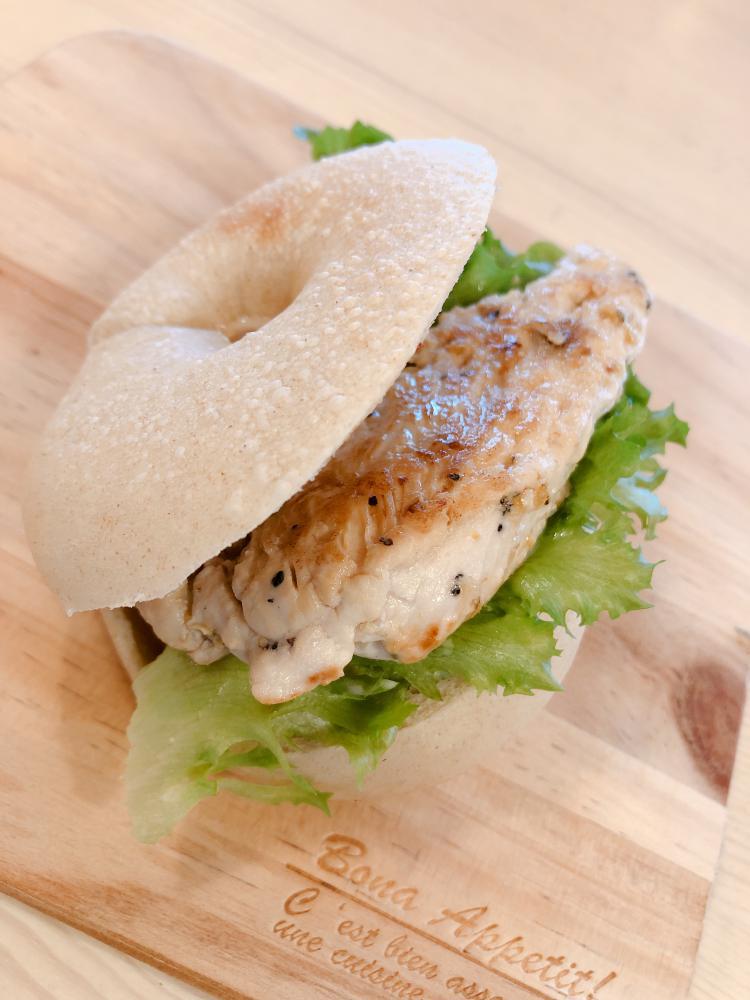 夏の限定サンドメニューです♪ゆず塩チキンサンド 250円(+ベーグル代)自家製ゆず塩に漬け込んだ柔らかい鶏胸肉を豪快にサンド!柚子の香りも爽やかで、とっても美味しいですよ!食欲がない暑い日にもおすすめです!!