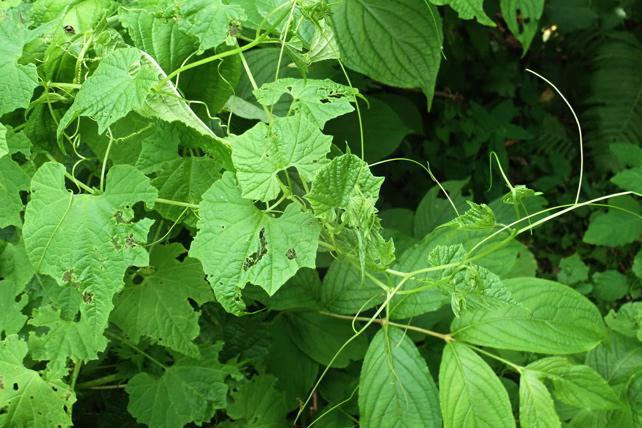 7/26 炎天下ですが標高780mですから涼風の影響で爽やかです。生えているところ(here)はトレイル沿いの草むらですからむし暑いです。つるの動きも複雑です。