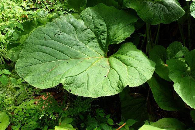 葉の長さ84cm〜巾54cmのジャンボ。亡くなられた植物学者結城嘉美さんは「志津オタカラコウ」を提唱したくらいだ。