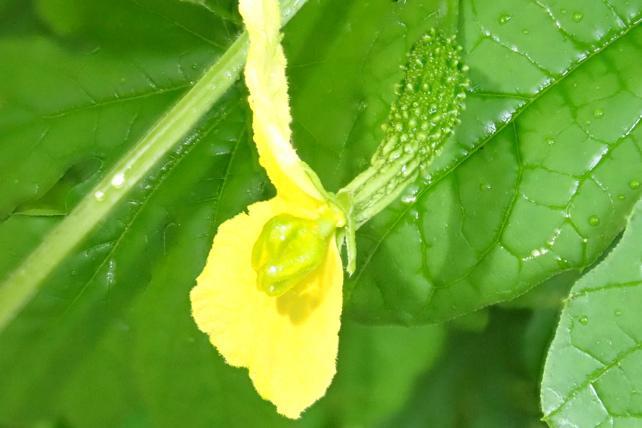 ゴウヤには同株に雄花と雌花が別々に付きます。やたら雄花が多く雌花が少ない。植え始め本葉5枚ぐらい出たら、芯を止める。そこから出る脇蔓に雌花が付くと言われています。送粉者は小さい昆虫が多く、 後半(8月中旬)以降わが家の場合メッチや雌花が多くなり実っています。