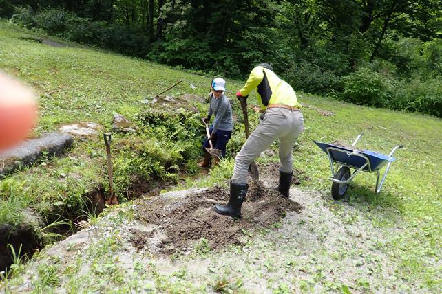 堆積して土管埋まるまでに。土砂はとにかく重い。本日の作業終わる。大木の影で西日遮られ木陰は涼しい。今日一日の終わり。