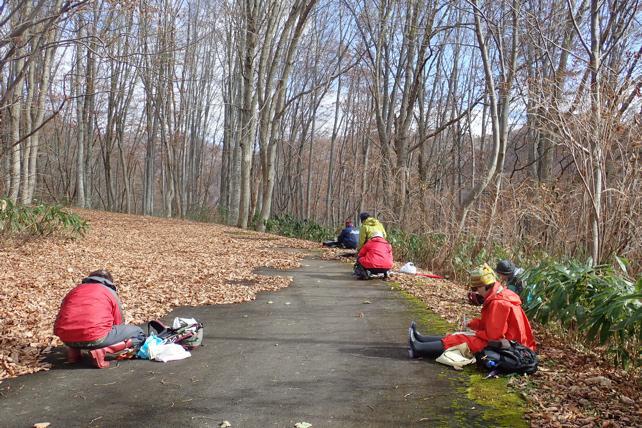 暖かい日指しが影を作る。「落葉のジュウタンは彩りとても難しいよね。」描いてみようか。2次林をバックにして。