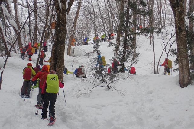 支所裏から直登する。積雪の山里ならではのスノーしゅーイングです。