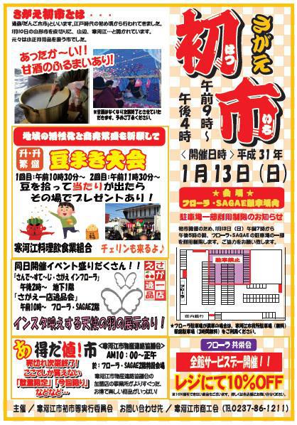 平成31年1月13日(日)にフローラ・SAGAEにてさがえ初市を開催いたします。当日はだんご木や初飴など、の縁起物の販売や、ソウルフードの販売が行われる他、市内飲食店の出店もあります。また、寒河江料理飲食業組合主催の益々繁盛豆まき大会が、午前10時30分、午前11時30分からとそれぞれ行われます。あたりが出たら景品プレゼントもあります。その他、寒河江市物産連絡協議会主催の得だね市、寒河江市商工会商業部会主催の一店逸品会の出展、フローラサンデーステージなど、同時開催が盛りだくさんですので、是非さがえ初市にお越しください。 ※詳細はチラシをご参照ください。チラシはこちらをクリックしてください。 ※駐車場につきましては、フローラ寒河江駐車場が満車の場合、寒河江駅前駐車場(3時間無料)等がございますので、そちらをご利用くださいますようお願いします。