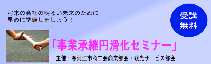 寒河江市商工会商業部会では、観光サービス部会との合同により、標記事業を実施する運びとなりました。将来、事業承継を行うにあたっての準備することや心構えなど、実際の取り組み事例や統計データを紹介しながらご説明いたします。 日 時 平成31年2月27日(水) 午後1時30分〜午後2時30分(2時間) 場 所 フローラ・SAGAE502会議室 講 師 澁川泰之氏(フレッシュストリームコンサルティング) 受 講 料 無料 ※詳しくはチラシをご覧ください。チラシダウンロードはこちら