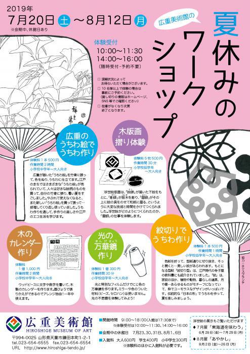 7月20日(土)から恒例イベント「夏休みのワークショップ」がスタートします!今年は5つのメニューを準備してお待ちしています。・広重のうちわ絵を使ったうちわ作り・紋切り遊びでうちわ作り・木版画の摺り体験・木のパーツでカレンダー作り・光の万華鏡作り7月20日(土)〜8月12日(月)の期間中、毎日10:00〜11:30、14:00〜16:00の時間で体験を受け付けています。イベント開催中の休館日は、7月23、30、31日、8月1、6日です。また、8月2日は午前・午後とも貸し切りとなります。予約は必要ありませんが、混雑状況によっては体験いただけない場合がございますので、ご了承ください。体験料のほかに入館料が必要です。皆さまのご参加をお待ちしております!