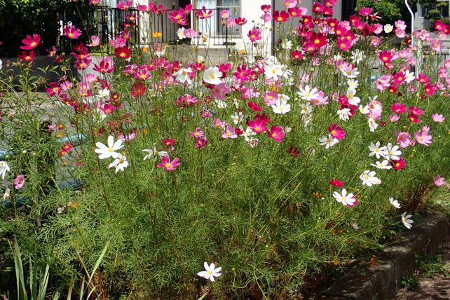 コスモス全開の公園がありました。お聞きするところによれば女の方有志のみなさんで花壇手入れしていてくれるのだそうです。そのコスモむ見事です。